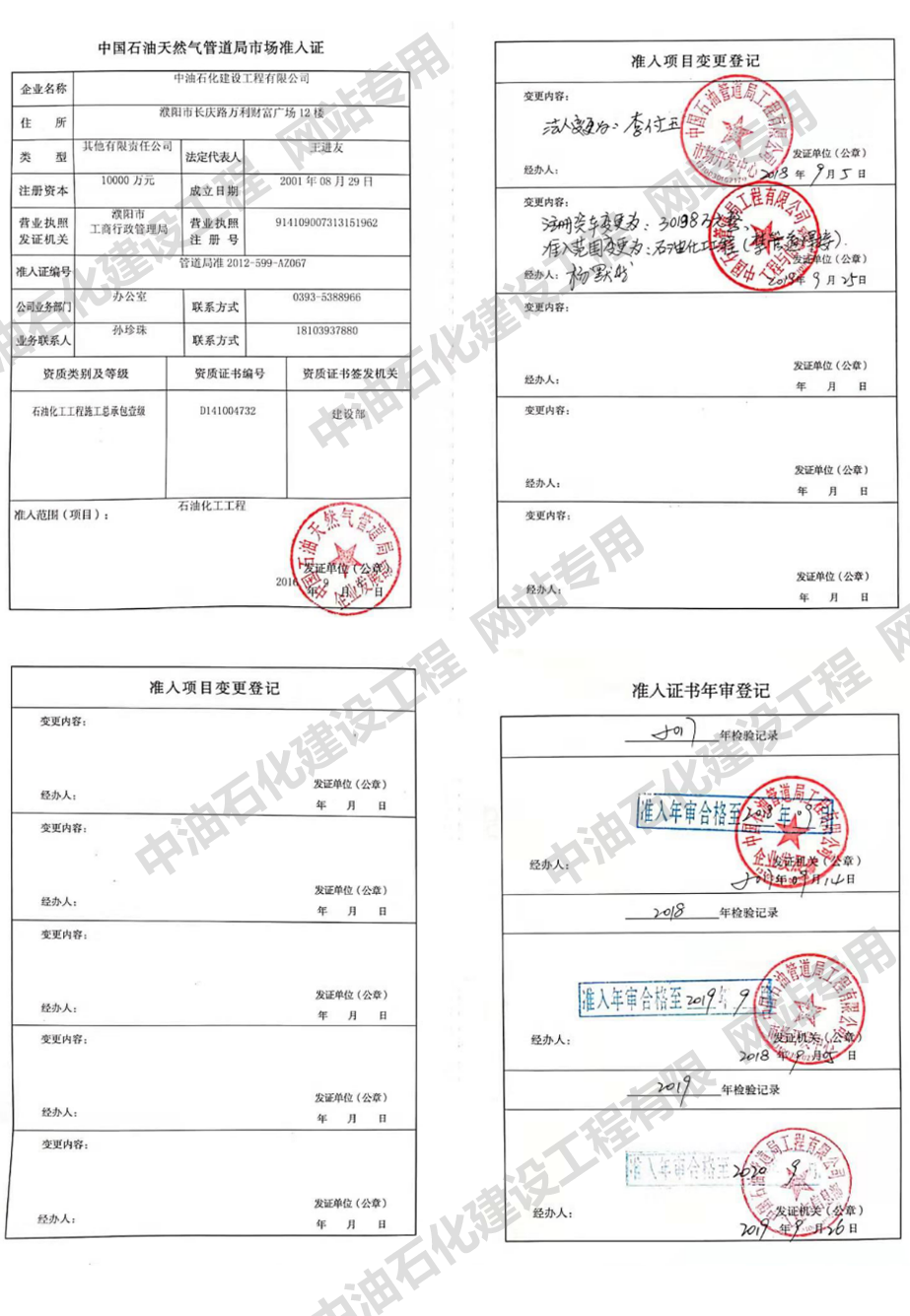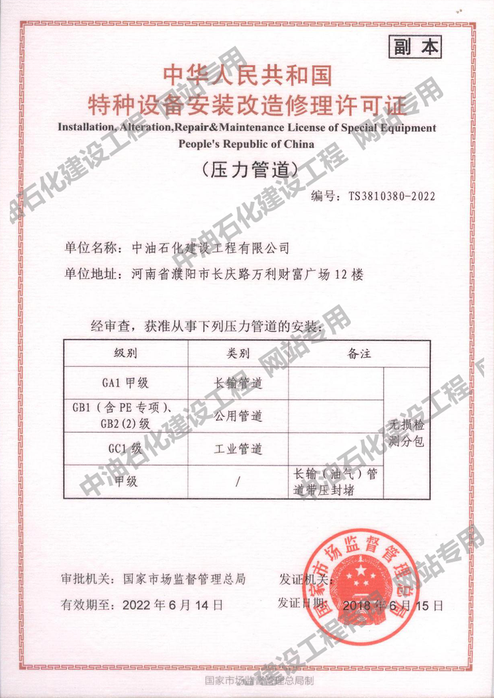 中油石化建設工程有限公司(CPPC)成立于2001年8月,公司現注冊資金1.1268億元。 經過20年的發展,CPPC形成了以石油化工安裝工程、長輸管道工程、市政工程、鋼結構制安為四大核心業務,以管道技術服務、送變電工程、消防工程、維保-搶險-投產保運為四大輔助配套業務的核心技術品牌,具備PC總承包能力和EPCC總承包能力。至2022年,公司具有施工總承包資質5項,施工專業承包資質4項,不分等級2項;特種設備壓力安裝改造維修許可證,承裝承修電力,中國工業清洗企業物理、化學清洗A級資質等。 公司成立20多年來,累計完成場站建設557座,管道施工6000多公里,輸電線路施工3700公里,電力電纜施工8000多公里,建筑施工950余萬平方米,年營業能力超過15 億元。